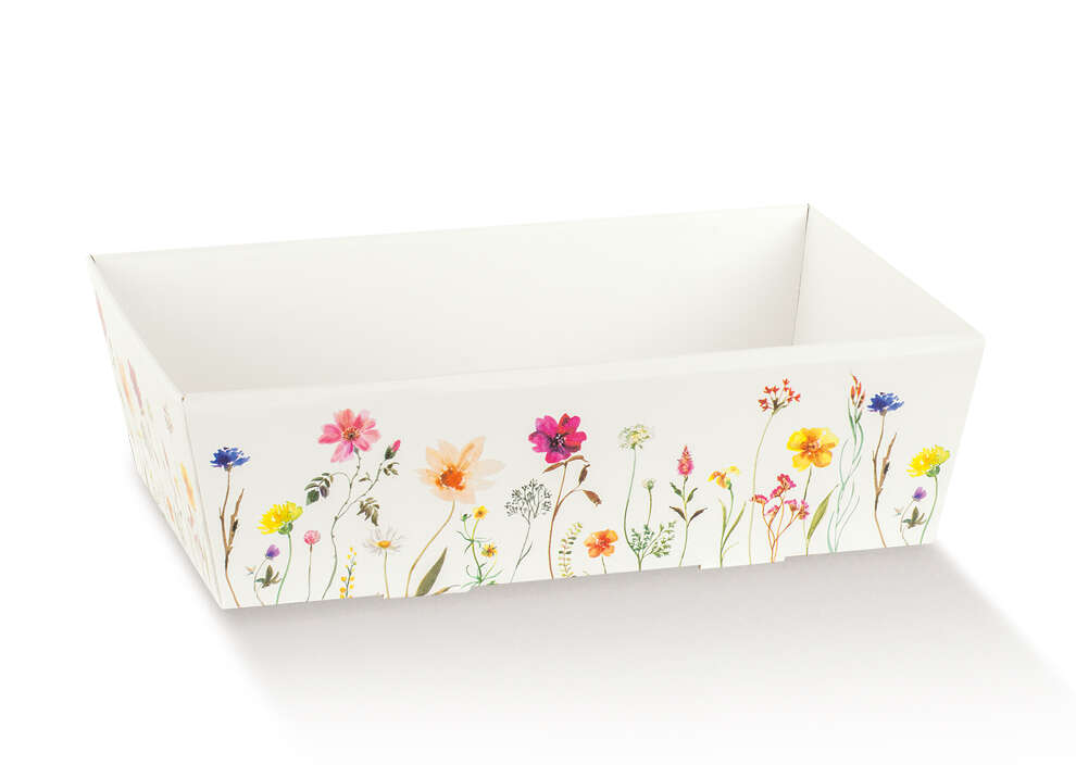 Dekoratives Tablett mit zarten Wildblumenmotiven in sanften, leuchtenden Farben. Ideal zum Präsentieren Ihrer Geschenksets oder Produkte – natürlich und elegant. Erhältlich in zwei Größen, passend zu all Ihren Arrangements.