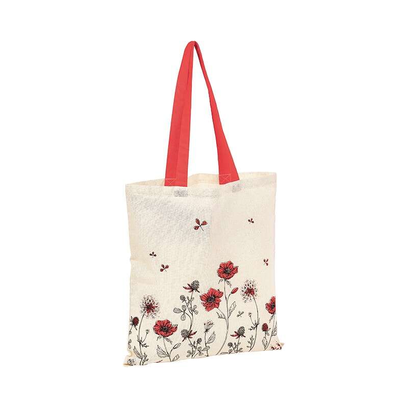 Diese Baumwolltasche mit rotem Blumenmuster und stabilen Henkeln ist ideal, um Ihre Einkäufe stilvoll zu transportieren. Praktisch und wiederverwendbar, perfekt für Einkaufs- oder Geschenkkörbe. Sie vereint Eleganz und Funktionalität für den täglichen Gebrauch.